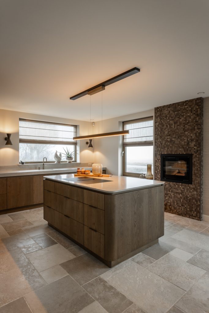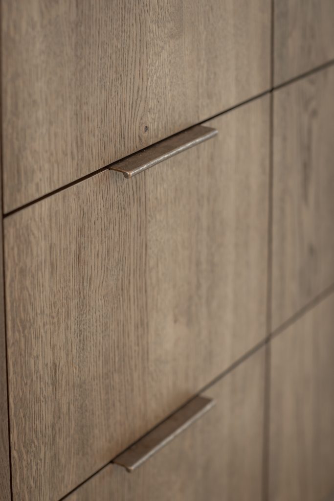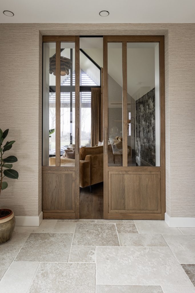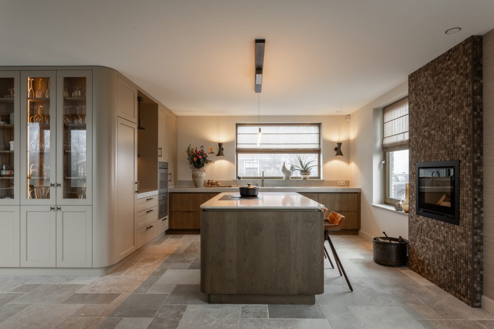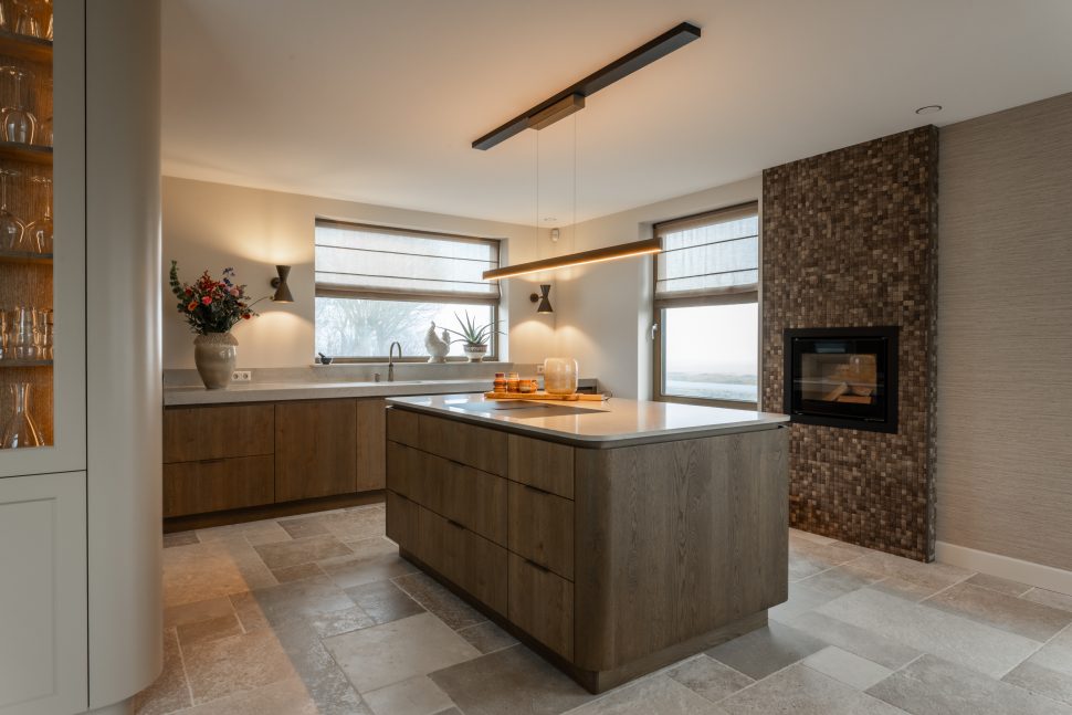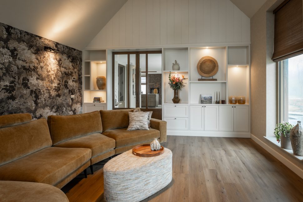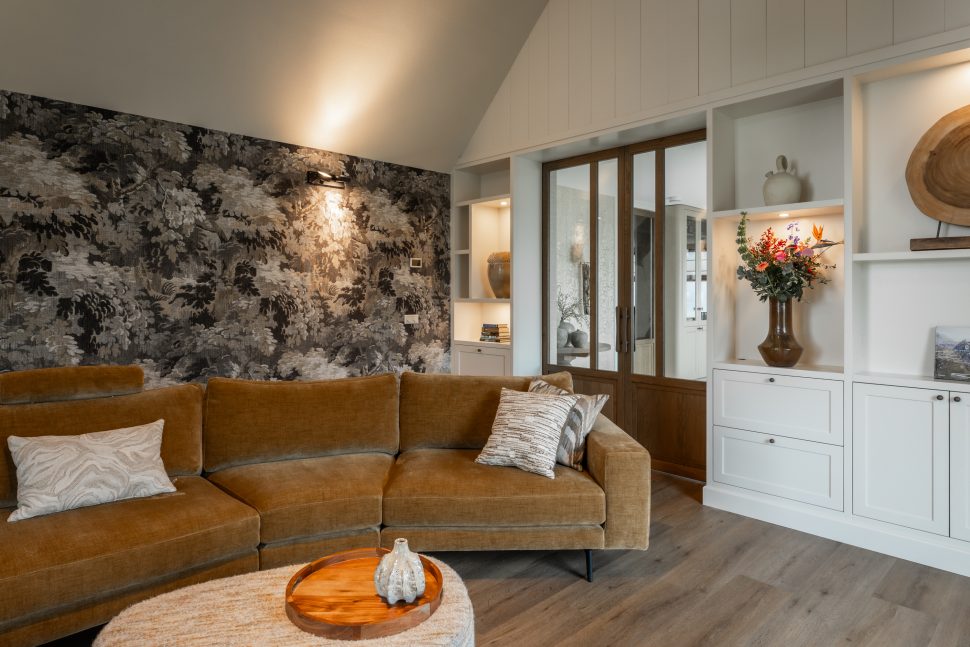 De schuifdeuren zijn afgewerkt met eiken fineer en verdwijnen bij het openen volledig in de wanden. Dit creëert een prachtige, open doorgang naar de woonkamer. Dankzij deze schuifdeuren kan de woonkamer eenvoudig worden afgesloten voor extra sfeer en geborgenheid, of juist worden geopend om een mooie verbinding met de keuken te maken. In de woonkamer hebben wij daarnaast een op maat gemaakte wandkast ontworpen. Deze kast combineert praktische opbergruimte met open vakken voor het presenteren van accessoires. Het resultaat is een echte eyecatcher die zowel esthetisch als functioneel een waardevolle toevoeging vormt aan de ruimte.