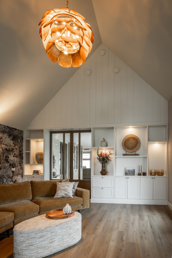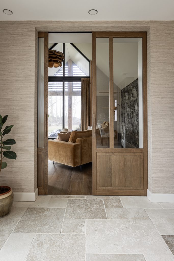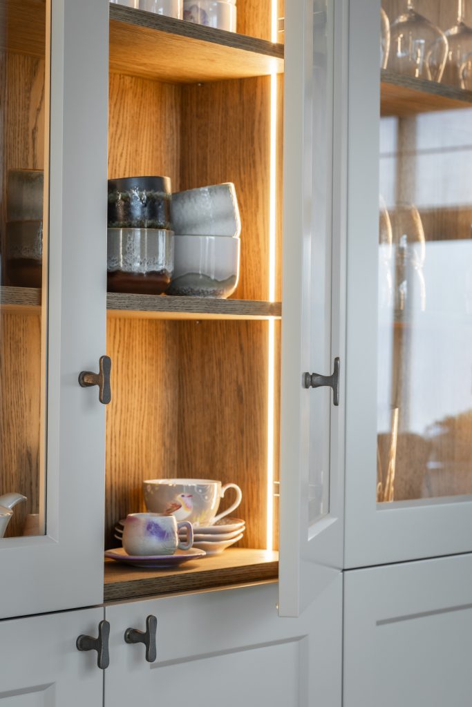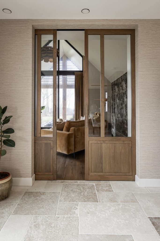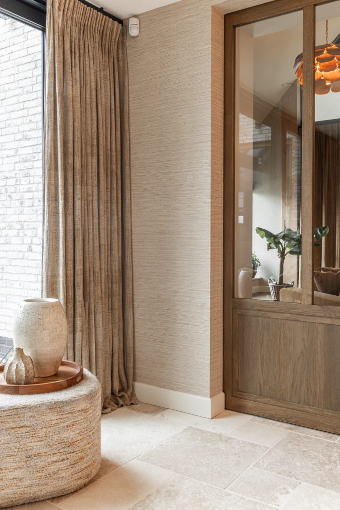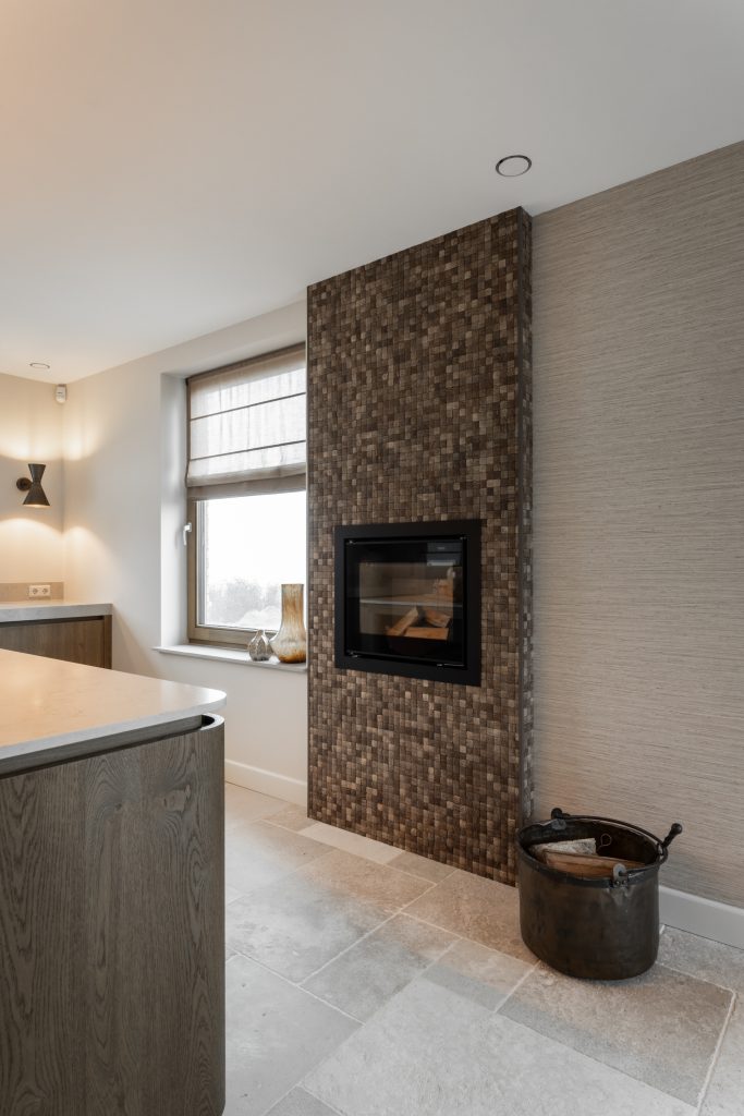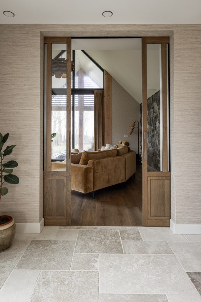 De schuifdeuren zijn afgewerkt met eiken fineer en verdwijnen bij het openen volledig in de wanden. Dit creëert een prachtige, open doorgang naar de woonkamer. Dankzij deze schuifdeuren kan de woonkamer eenvoudig worden afgesloten voor extra sfeer en geborgenheid, of juist worden geopend om een mooie verbinding met de keuken te maken. In de woonkamer hebben wij daarnaast een op maat gemaakte wandkast ontworpen. Deze kast combineert praktische opbergruimte met open vakken voor het presenteren van accessoires. Het resultaat is een echte eyecatcher die zowel esthetisch als functioneel een waardevolle toevoeging vormt aan de ruimte.