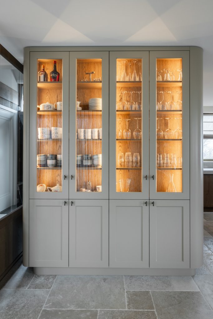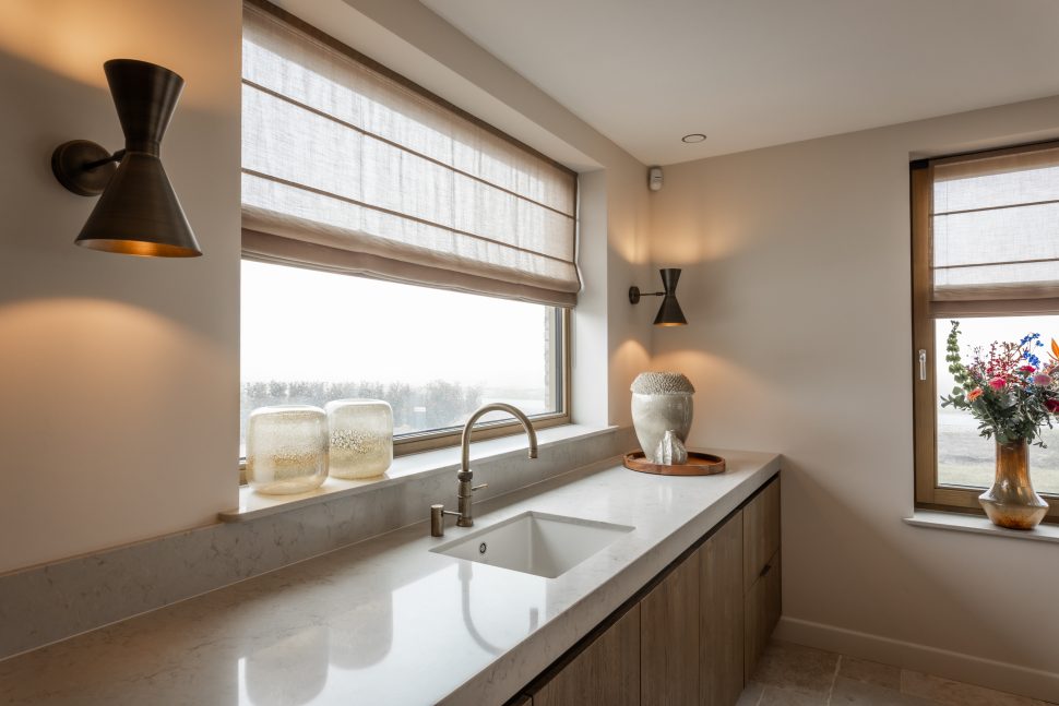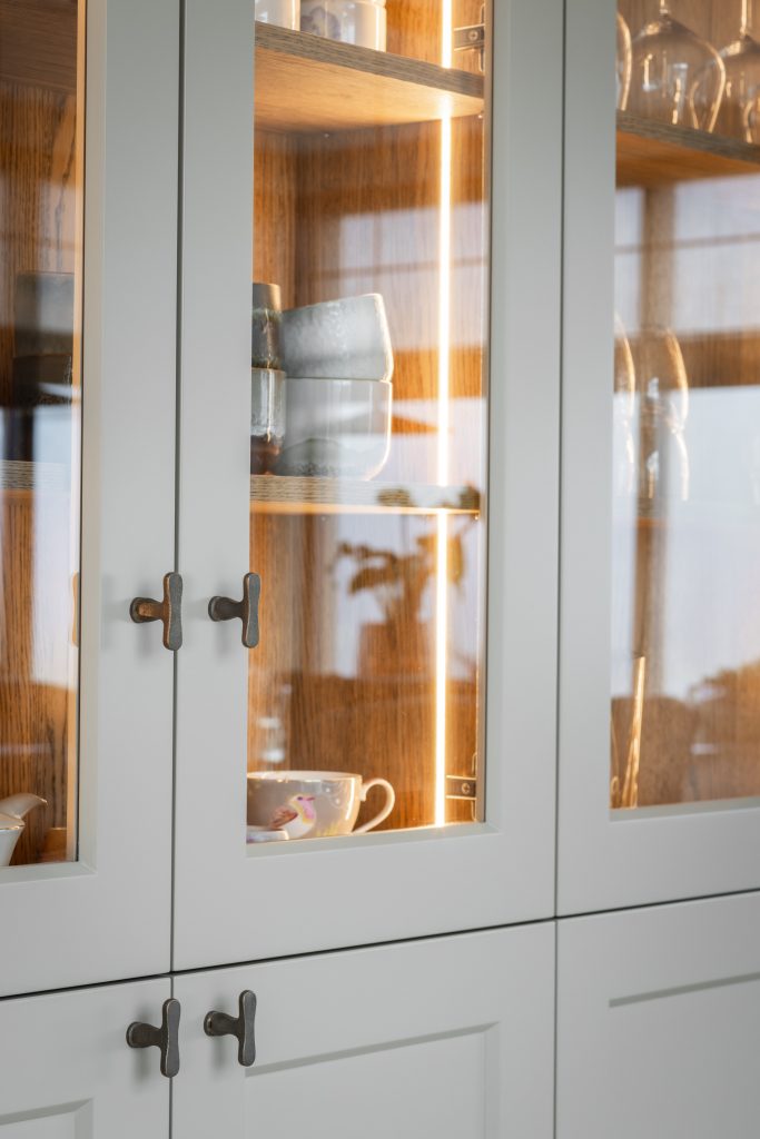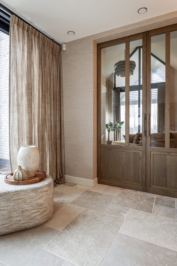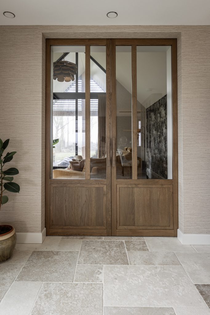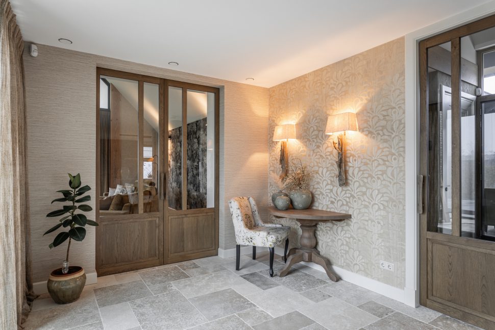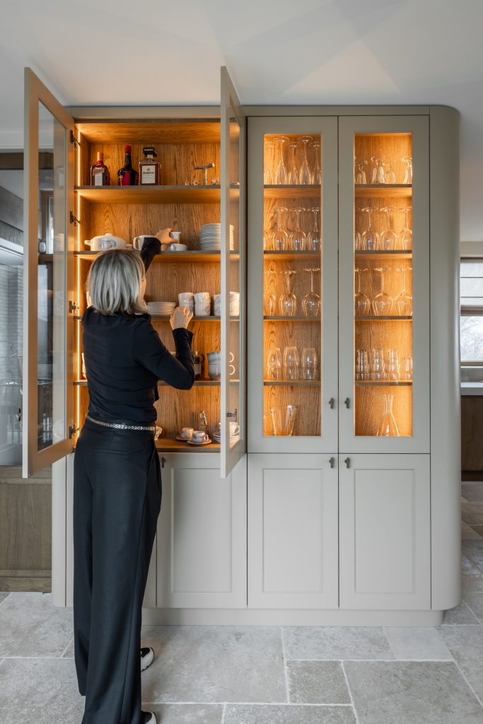 De schuifdeuren zijn afgewerkt met eiken fineer en verdwijnen bij het openen volledig in de wanden. Dit creëert een prachtige, open doorgang naar de woonkamer. Dankzij deze schuifdeuren kan de woonkamer eenvoudig worden afgesloten voor extra sfeer en geborgenheid, of juist worden geopend om een mooie verbinding met de keuken te maken. In de woonkamer hebben wij daarnaast een op maat gemaakte wandkast ontworpen. Deze kast combineert praktische opbergruimte met open vakken voor het presenteren van accessoires. Het resultaat is een echte eyecatcher die zowel esthetisch als functioneel een waardevolle toevoeging vormt aan de ruimte.