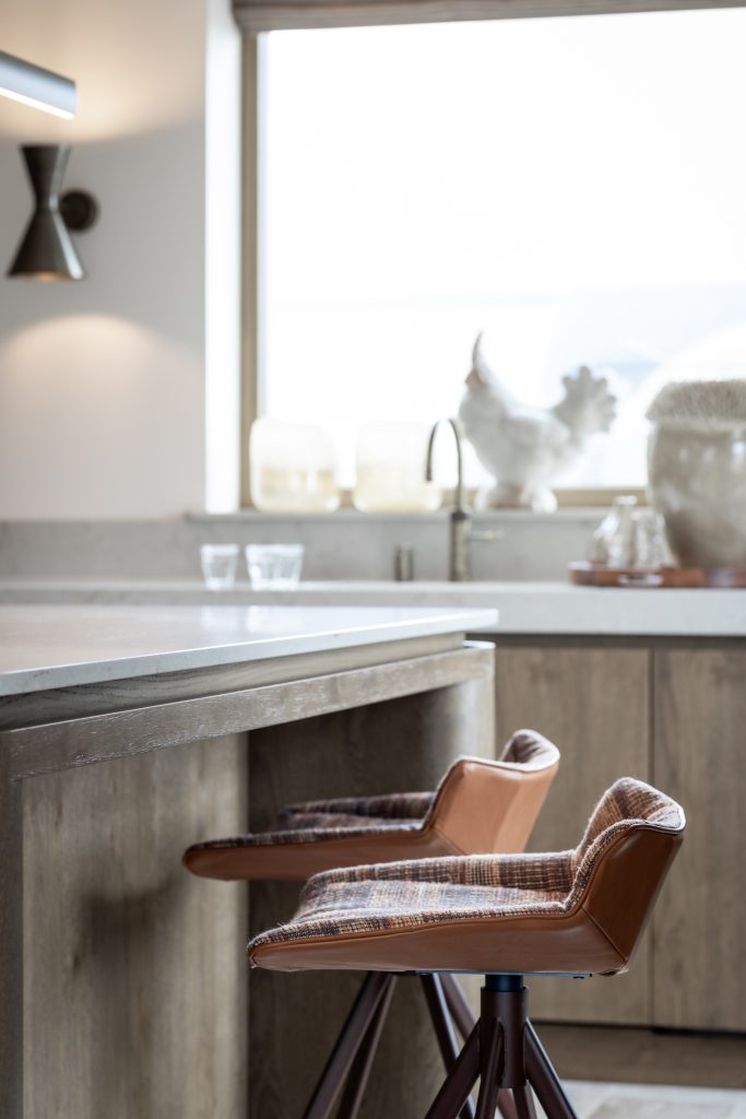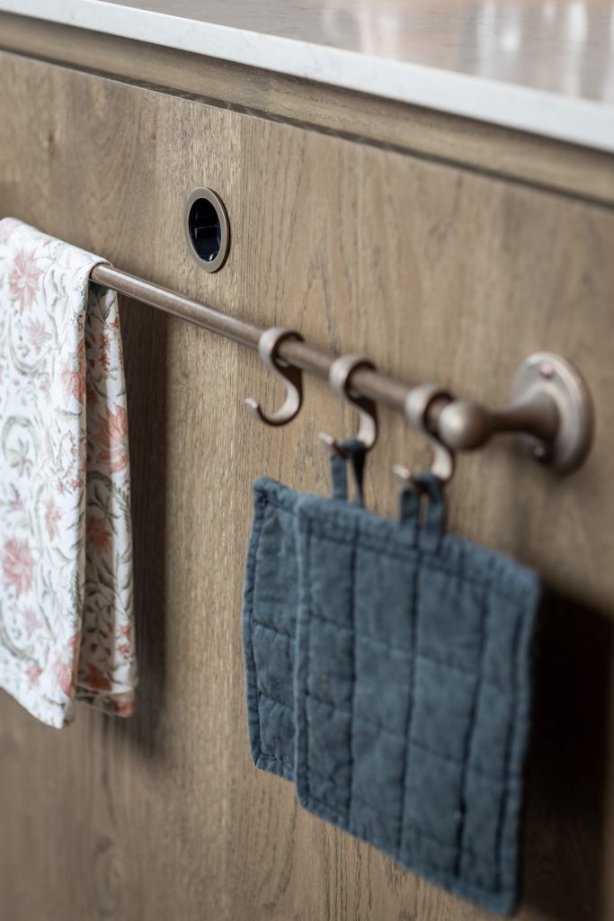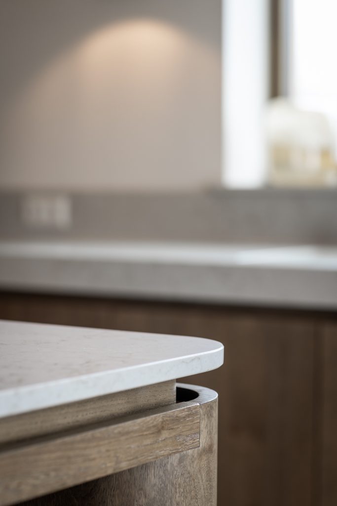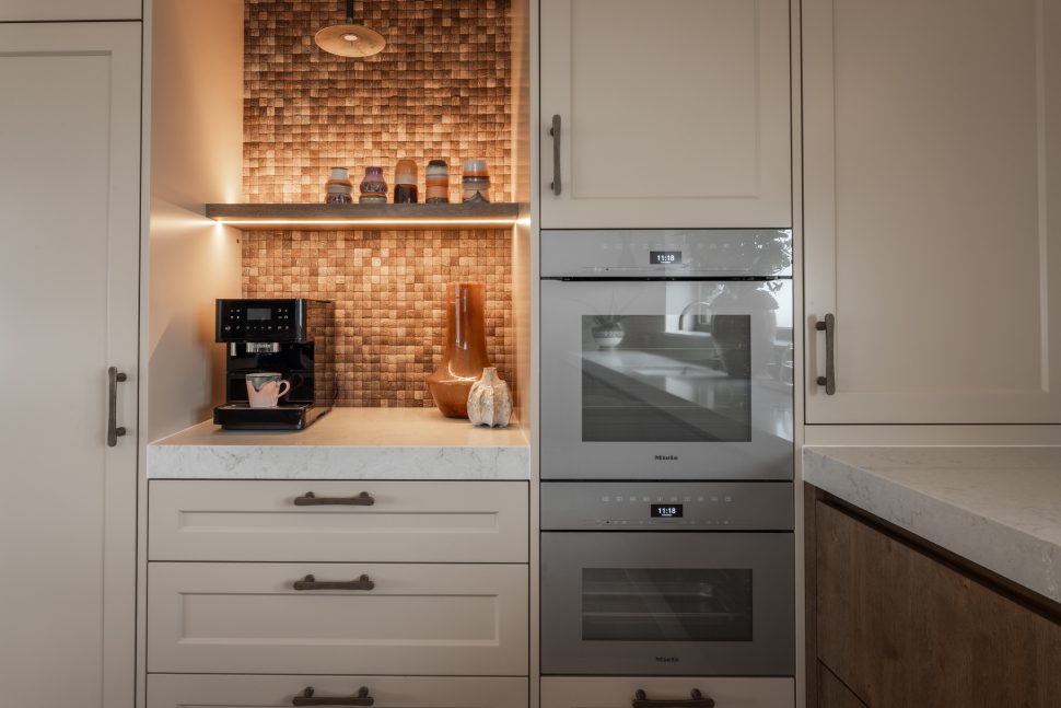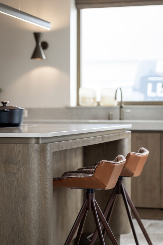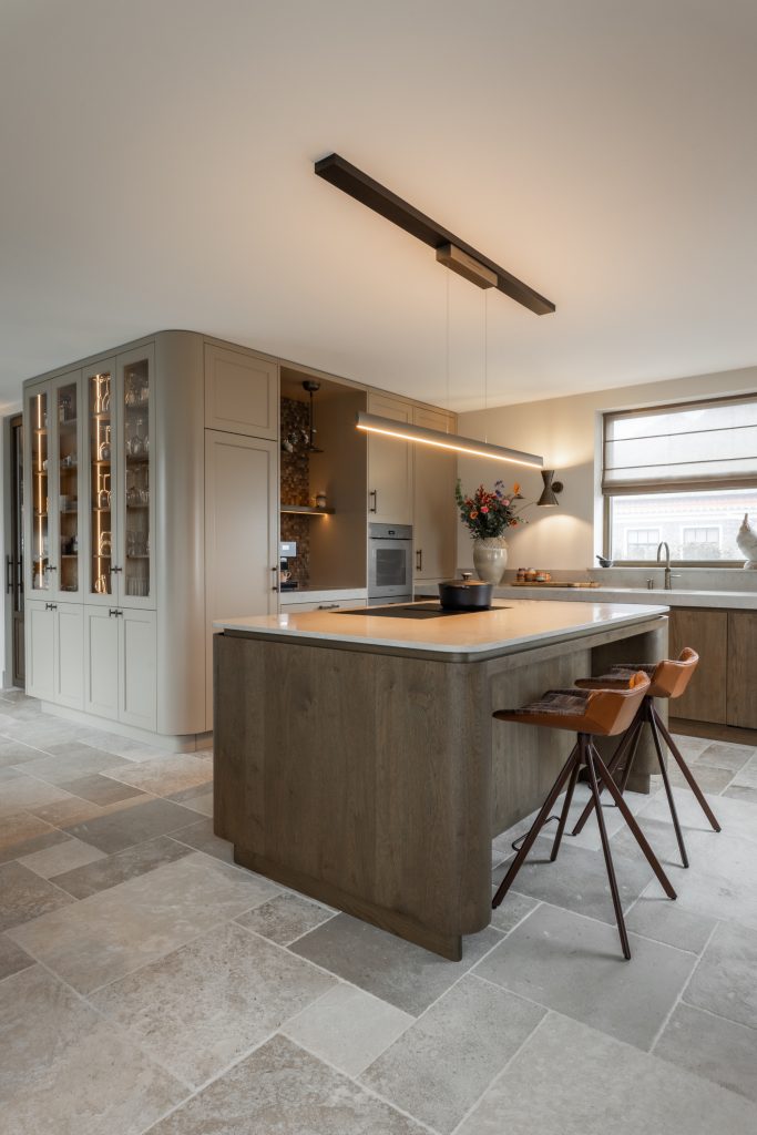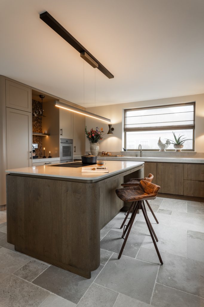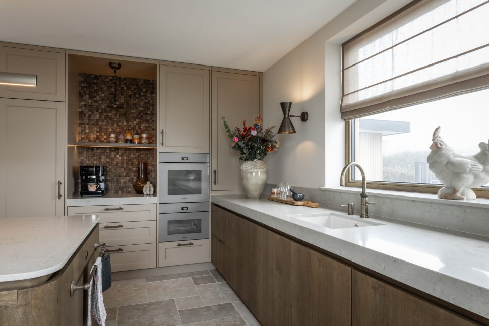 Deze exclusieve keuken combineert tijdloze elegantie met moderne verfijning. Het keukenblad is gemaakt van hoogwaardig composiet in de kleur Taj Royaal. Dit blad sluit perfect aan bij de warme kleurtonen van het interieur. De fronten uitgevoerd in eikenfineer geven de keuken een warme en natuurlijke uitstraling. De gespoten fronten zijn uitgevoerd in een klassieke stijl met een warme spuitkleur die rust en verfijning uitstraalt. Het samenspel van klassieke en moderne elementen zorgt voor een krachtig contrast tussen traditioneel en eigentijds design. De subtiele rondingen zorgen voor een zachte, uitnodigende uitstraling. De messing accenten in zowel de kraan als de grepen versterken de luxueuze uitstraling. Dit sluit allemaal perfect aan bij het stijlvol geïntegreerde Miele-apparatuur, in de verfijnde kleur Pearl Beige. Deze keuken is niet alleen een plek om te koken, maar een verlengstuk van het interieur. Een ruimte waarin esthetiek, comfort en gebruiksgemak samenkomen in een uniek en harmonieus ontwerp.