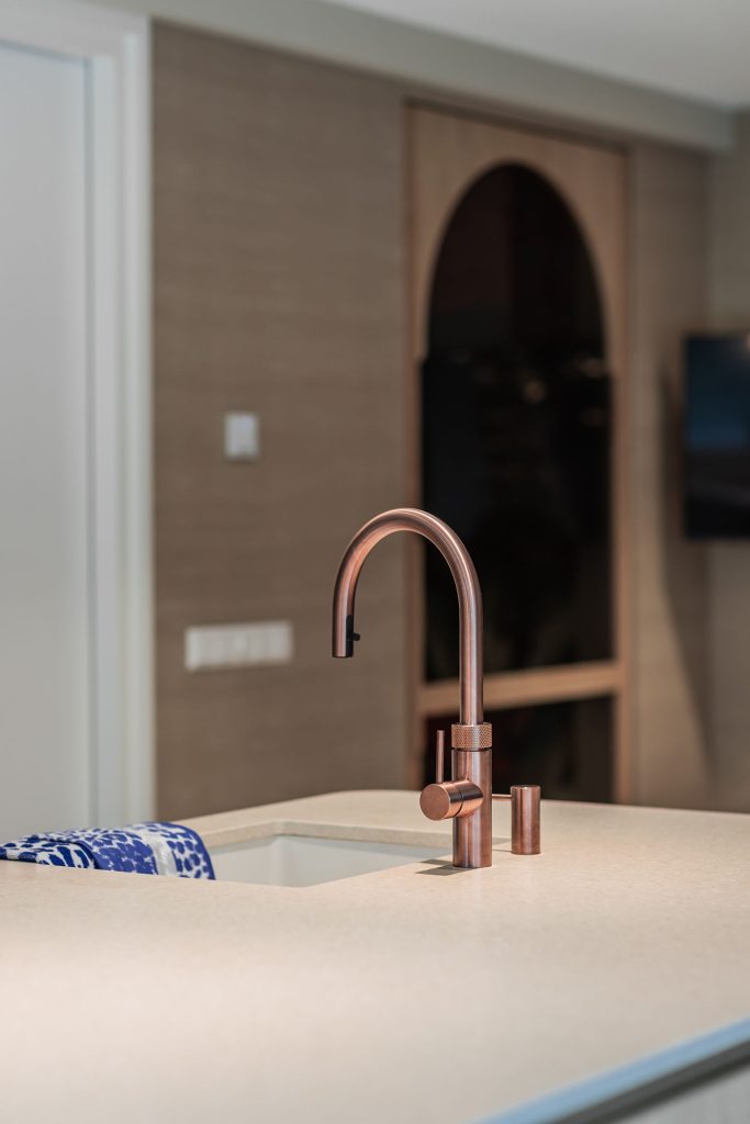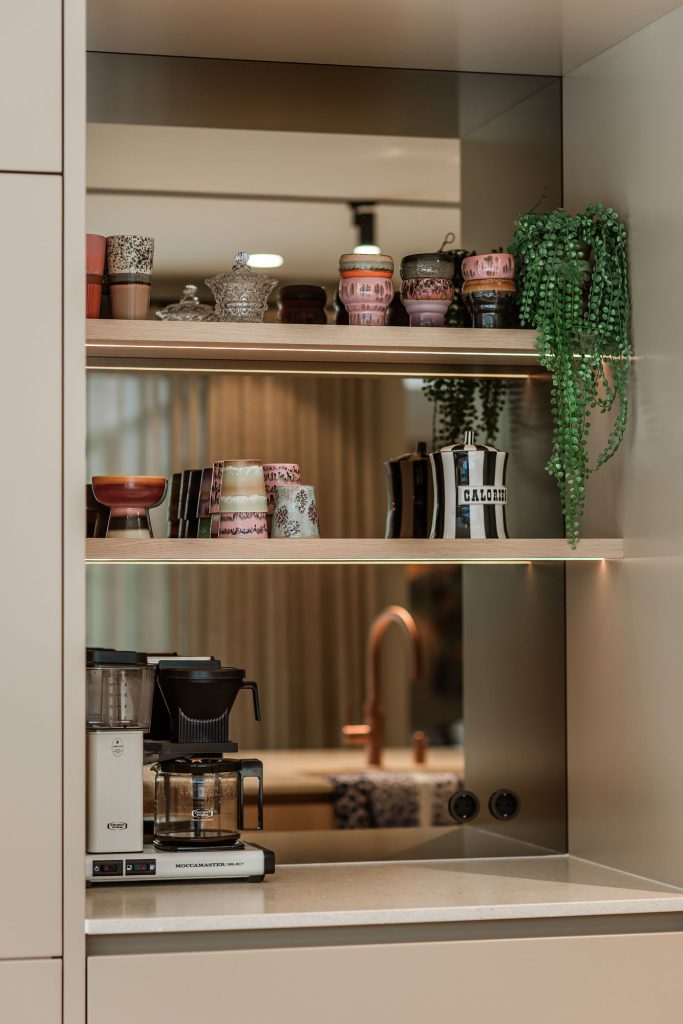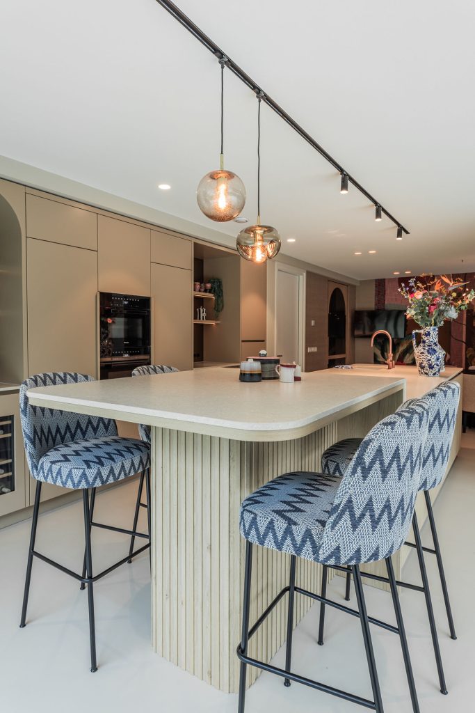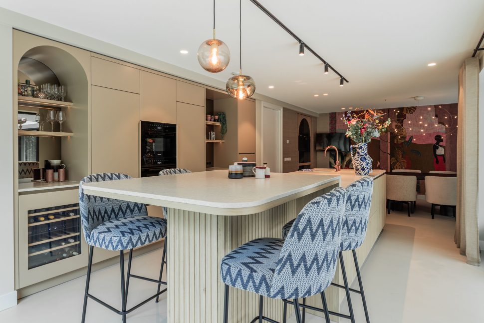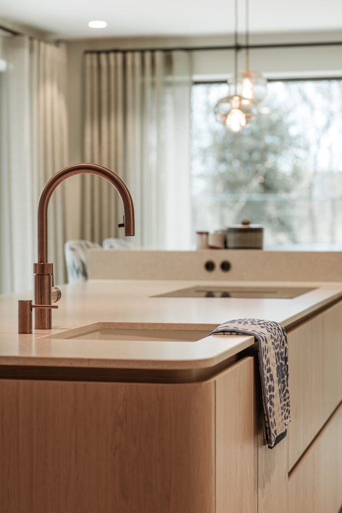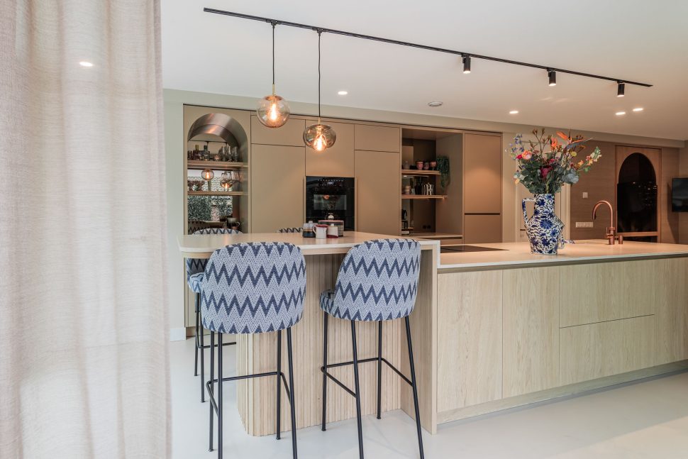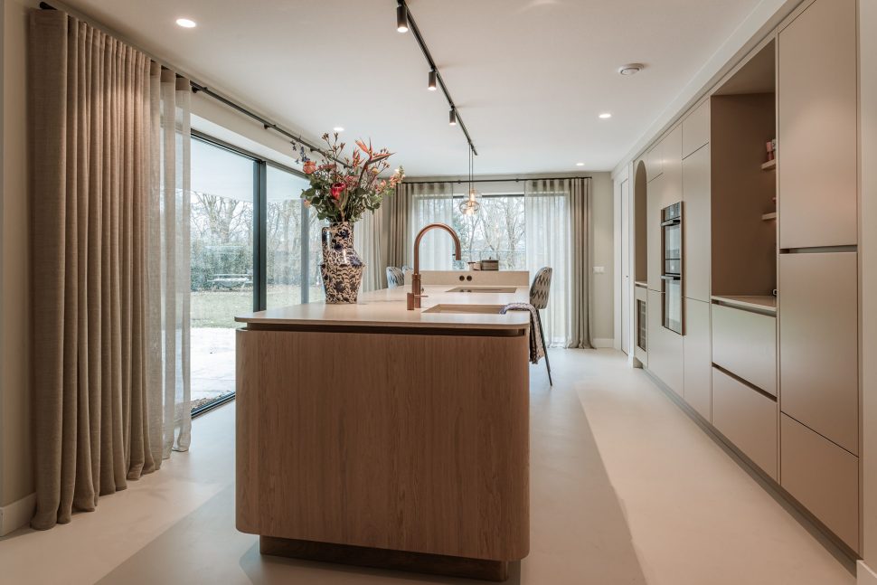 Deze keuken combineert modern design met zachte rondingen en luxe materialen tot een warm en verfijnd geheel. Het composieten werkblad in de kleur Cava Mocca vormt een elegant contrast met het maatwerk eiland in eiken fineer, waarin afgeronde hoeken zorgen voor een rustige, uitnodigende uitstraling. De keukenwand is strak afgewerkt met spuitwerk. In de wand is een elegante toog geïntegreerd waarin functionaliteit en esthetiek samenkomen, terwijl de bronzen spiegelachterwand het ontwerp verrijkt met extra licht en diepte. Het eiland is uitgevoerd met een bar op hoogte, waarbij het bargedeelte duidelijk verhoogd is ten opzichte van het werkblad en zo op een natuurlijke manier het ontwerp doorbreekt. De verlichting accentueert de lijnen en materialen en versterkt de luxe sfeer. Afgeronde details komen overal in het ontwerp terug en creëren een harmonieus geheel. De Quooker-kraan en zeeppomp in rosé koper vormen de verfijnde finishing touch en sluiten perfect aan bij de warme tinten van de keuken.