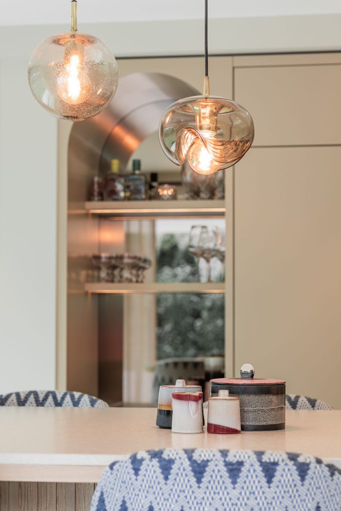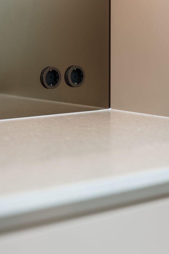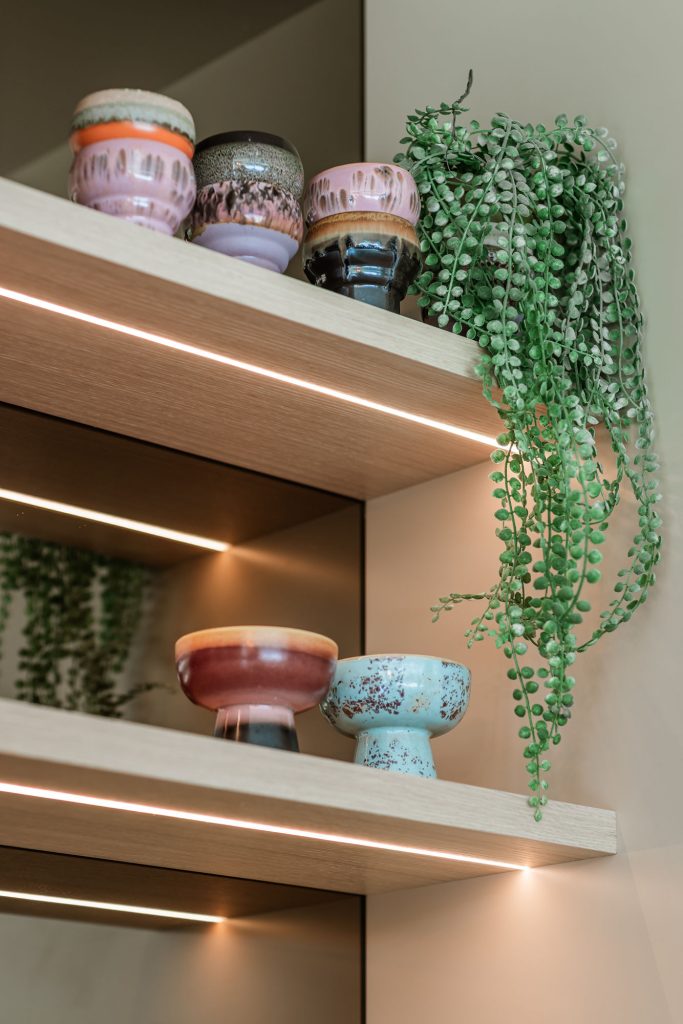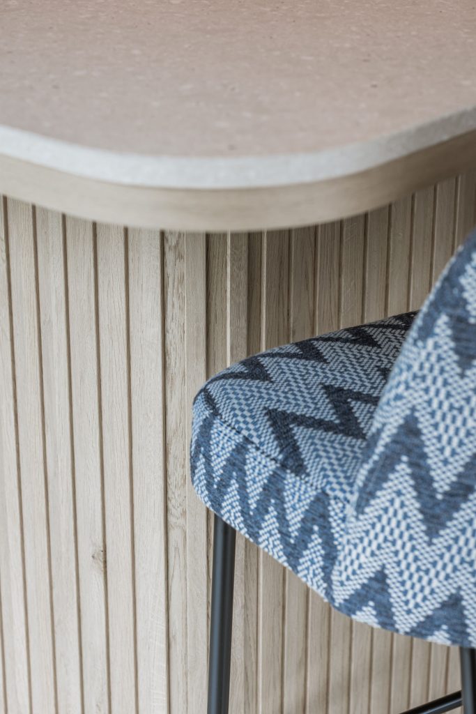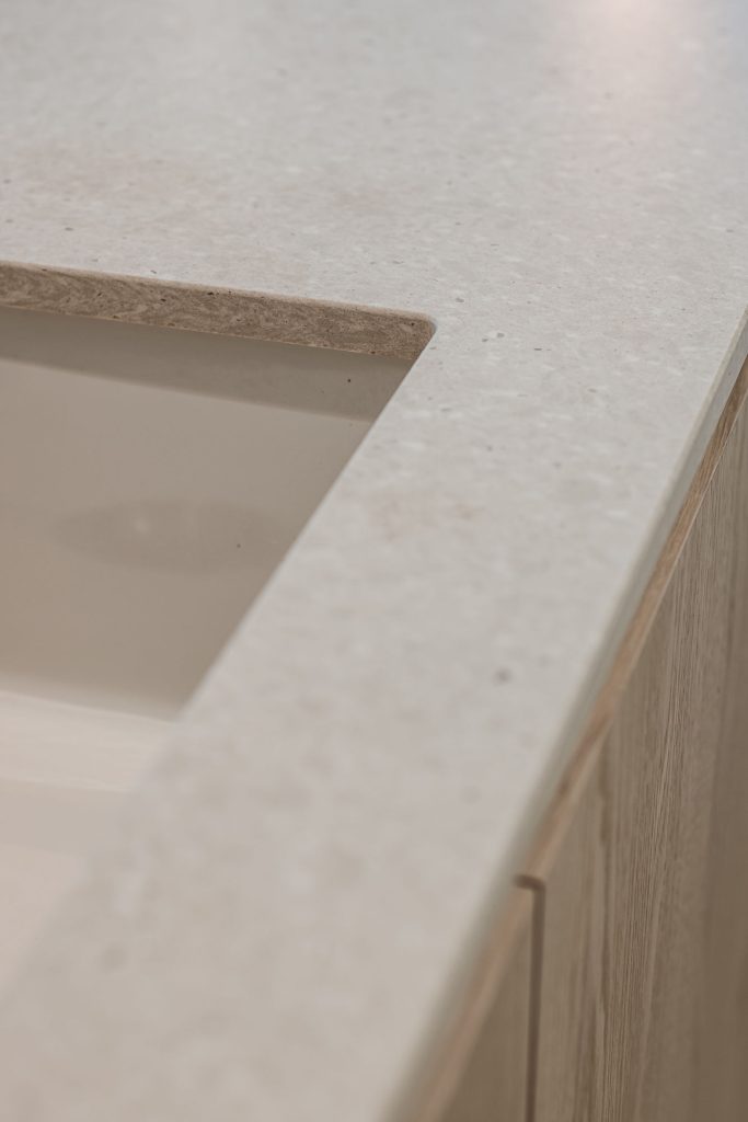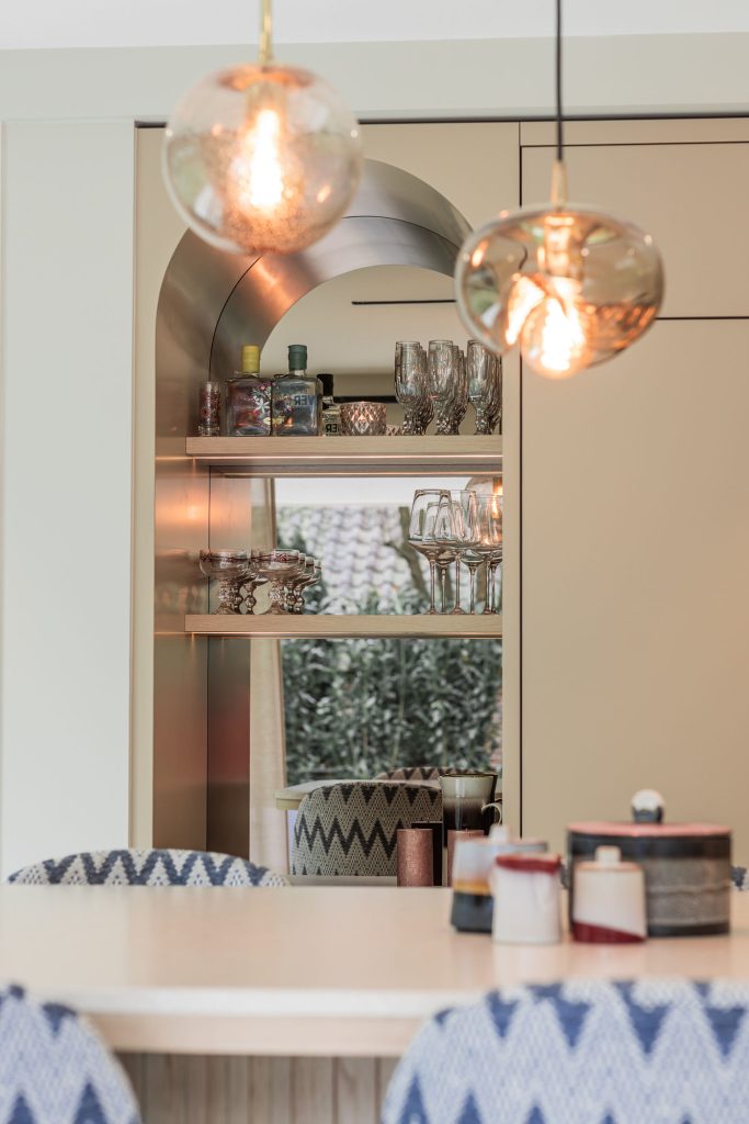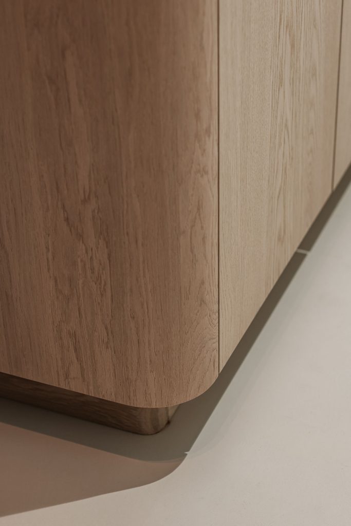 Deze keuken combineert modern design met zachte rondingen en luxe materialen tot een warm en verfijnd geheel. Het composieten werkblad in de kleur Cava Mocca vormt een elegant contrast met het maatwerk eiland in eiken fineer, waarin afgeronde hoeken zorgen voor een rustige, uitnodigende uitstraling. De keukenwand is strak afgewerkt met spuitwerk. In de wand is een elegante toog geïntegreerd waarin functionaliteit en esthetiek samenkomen, terwijl de bronzen spiegelachterwand het ontwerp verrijkt met extra licht en diepte. Het eiland is uitgevoerd met een bar op hoogte, waarbij het bargedeelte duidelijk verhoogd is ten opzichte van het werkblad en zo op een natuurlijke manier het ontwerp doorbreekt. De verlichting accentueert de lijnen en materialen en versterkt de luxe sfeer. Afgeronde details komen overal in het ontwerp terug en creëren een harmonieus geheel. De Quooker-kraan en zeeppomp in rosé koper vormen de verfijnde finishing touch en sluiten perfect aan bij de warme tinten van de keuken.