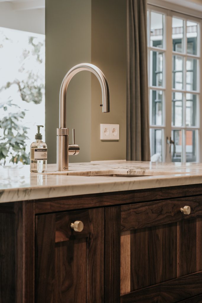 Deze unieke keuken i is volledig gemaakt van massief noten en is door zijn vele unieke details een echt pronkstuk in huis. In de keuken vind je een prachtige combinatie van natuurlijke en hoogwaardige materialen terug, zoals massief noten en een marmerblad. Voor dit ontwerp is over elk detail nagedacht en dat maakt dat deze ruimte klopt. Dit geeft de keuken een natuurlijk contrast. De verschillende afwerkingen en talloze toffe details maken dit geheel tot een luxe high-end keuken. De groene kleur op de wanden zorgen voor een huiselijke, frisse en natuurlijke sfeer. Het is dan ook een ware leefkeuken, waar je na een hectische dag weer even tot rust kan komen. De ruimte is warm en sfeervol.