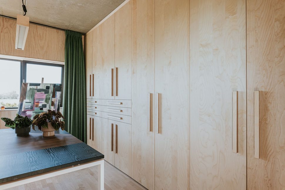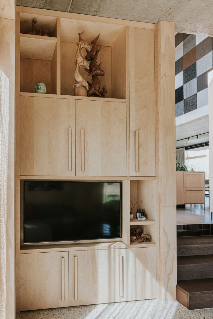 Elk detail is zorgvuldig overwogen, waardoor de woning volledig in balans voelt. Hout vormt het hoofdmateriaal en is overal in het interieur terug te vinden. Dit zorgt voor rust, eenheid en een warme, natuurlijke uitstraling. Het interieur ademt een huiselijke en frisse sfeer, waarin je je direct welkom voelt. In de woonkamer vormt het op maat gemaakte tv-meubel een elegant middelpunt. Het combineert praktische opbergruimte met een strakke, verfijnde uitstraling en sluit perfect aan bij de natuurlijke materialen die door de rest van het interieur lopen. Zo blijft de ruimte overzichtelijk en sfeervol, terwijl het meubel tegelijkertijd functioneel is voor dagelijks gebruik.